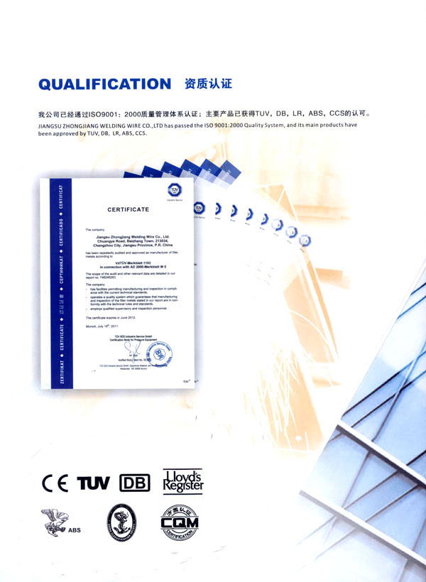 江蘇中江焊絲有限公司成立于1989年,注冊資金2188萬元,是一家專業(yè)從事氣體保護鍍銅焊絲、鋁焊絲、藥芯焊絲和埋弧焊絲的生產(chǎn)企業(yè)。 經(jīng)過近20年的不懈努力,目前企業(yè)年生產(chǎn)各類焊絲達50000余噸,產(chǎn)品不僅銷往全國各省市和地區(qū),還出口到美國、意大利、英國、法國、西班牙、波蘭、捷克、斯洛伐克、立陶宛、斯洛文尼亞、俄羅斯、烏克蘭、希臘、以色列、伊朗、南非、泰國、印尼、印度、澳大利亞等三十幾個國家和地區(qū)。 江蘇中江焊絲有限公司是通過IS09001:2000質(zhì)量管理體系認證的企業(yè),其主要產(chǎn)品已獲得TUV,DB,LR,ABS,CCS的認可。企業(yè)奉行“一流的產(chǎn)品,一流的信譽,一流的服務”的宗旨,竭誠為客戶服務。
