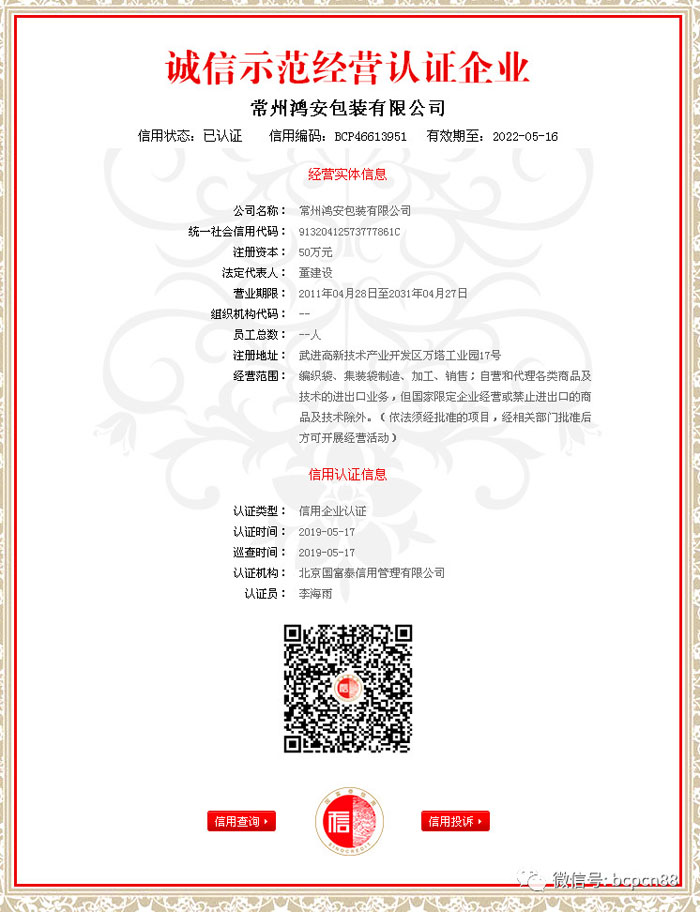 常州鴻安包裝有限公司 首頁 >> 專題 >> 信用單位示范展示