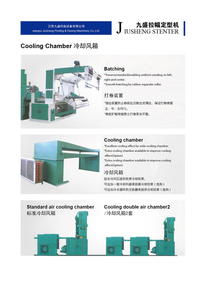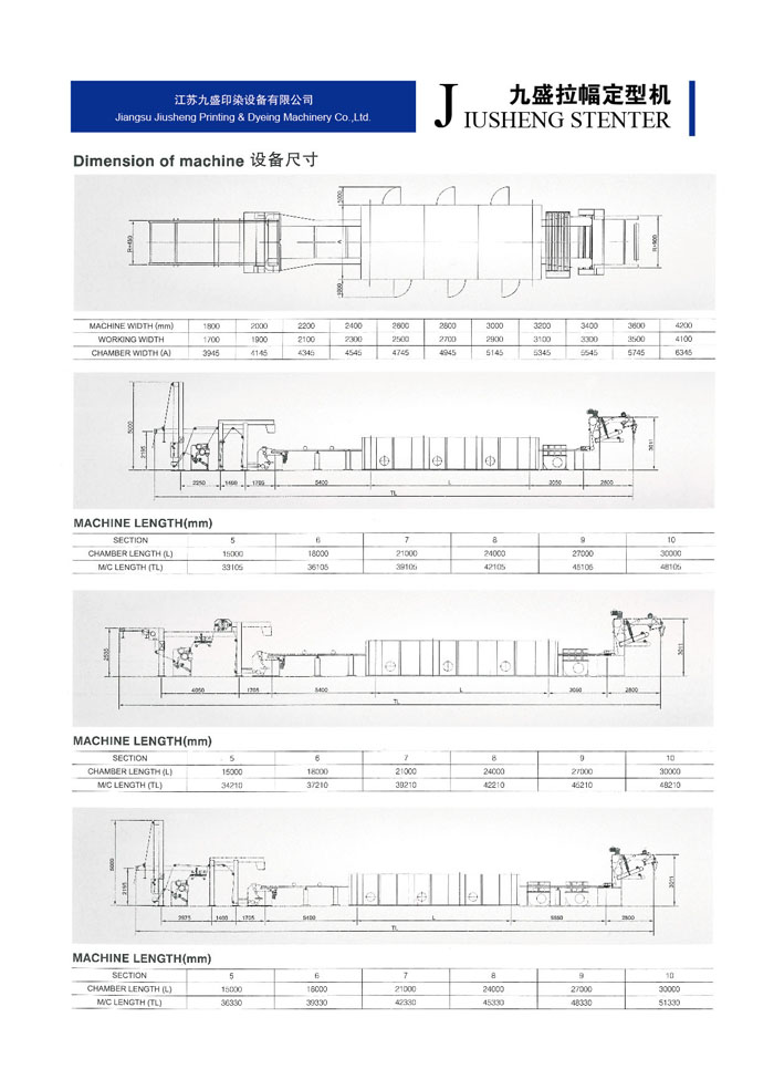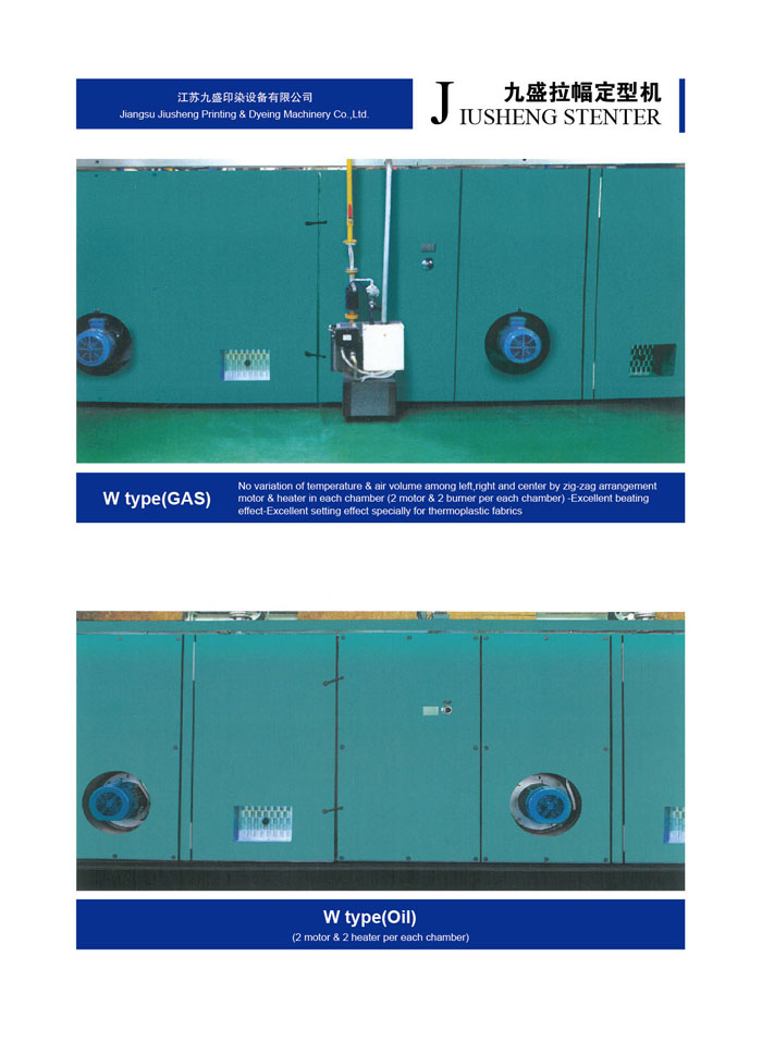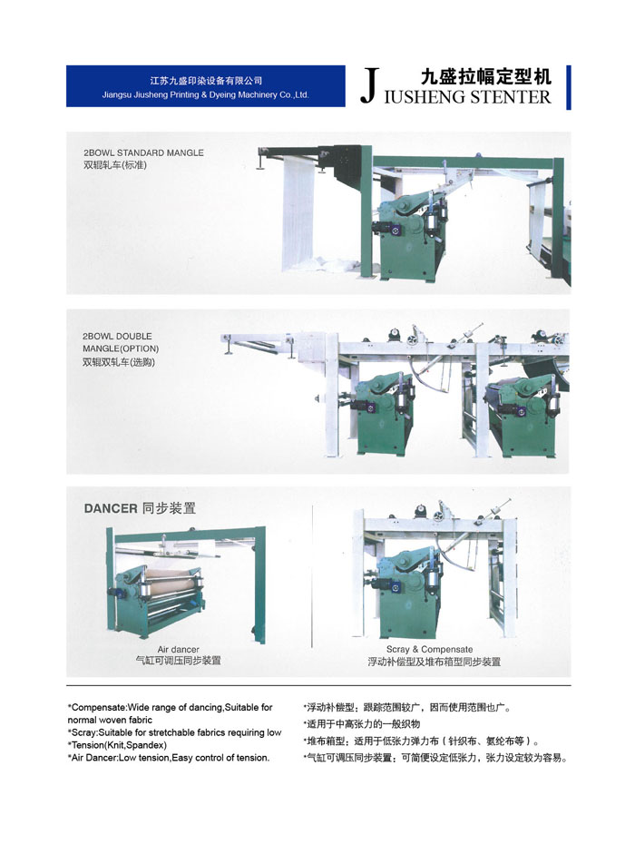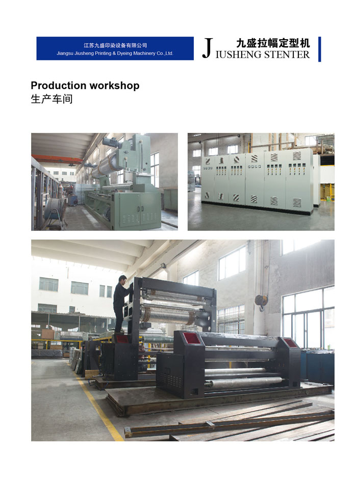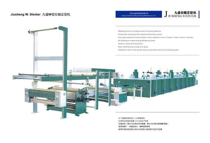 江蘇九盛印染設(shè)備有限公司(原江蘇鵬輝印染機(jī)械有限公司)創(chuàng)建于1986年,北長(zhǎng)江,所在地區(qū)內(nèi)鐵路、高等級(jí)公路縱橫成網(wǎng),常州長(zhǎng)江公路大橋飛架大江南北,水陸交通十分便利。公司有近二十年的熱定型機(jī)設(shè)計(jì)、生產(chǎn)經(jīng)驗(yàn)、有批從事新型熱定機(jī)開(kāi)發(fā)、設(shè)計(jì)的專(zhuān)業(yè)人才,具有豐富生產(chǎn)和制作經(jīng)驗(yàn)的技師和技工。已成為國(guó)內(nèi)頗具名聲的機(jī)械制作企業(yè)。 樹(shù)脂定型是染整工程最后的程序,因此定型機(jī)的設(shè)計(jì)及操作技術(shù)成為決定織物品質(zhì)重要的一環(huán),九盛公司多年的經(jīng)驗(yàn)改良完成新生代定型機(jī),針對(duì)業(yè)者需要對(duì)于節(jié)省人力布匹張力的減少、緯紗的調(diào)整,風(fēng)量的調(diào)節(jié),布邊控制及切邊損耗及至于熱能保持,維修工作,操作管理都有卓越表現(xiàn)及實(shí)際成果,而機(jī)械的研制及生產(chǎn)技術(shù)的發(fā)展是本公司創(chuàng)立的目標(biāo)和宗旨。
