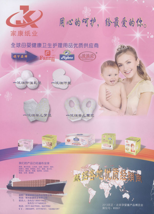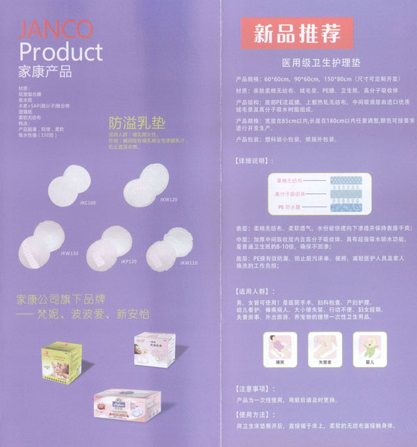 中國(JANCO)家康衛(wèi)生用品公司成立于2004年,我們專注于研發(fā)、設計、及制造健康的衛(wèi)生用品。我們的產品包括防溢乳墊、汗墊、寶寶背墊、圍兜、護理墊等。我們的生產廠房建設在中國江蘇省常州市,這是一個非常美麗的城市,并且我們的廠區(qū)鄰近沿江高速,交通非常便利。