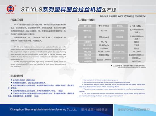 常州神通機(jī)械制造有限公司位于滆湖之盼,依托常州市武進(jìn)區(qū)優(yōu)越的地理環(huán)境,公司創(chuàng)建于1992年,是專(zhuān)業(yè)生產(chǎn)塑料機(jī)械拉絲機(jī)成套設(shè)備的企業(yè)。 神通公司經(jīng)過(guò)30年多來(lái)的艱辛創(chuàng)業(yè),在塑料機(jī)械行業(yè)中積累了豐富的經(jīng)驗(yàn),為擴(kuò)大生產(chǎn)能力,提升產(chǎn)品質(zhì)量,新組建了一個(gè)技術(shù)緊密合作型企業(yè),并具有獨(dú)立法人資質(zhì),即為宜興順通機(jī)械制造有限公司。我們會(huì)一如既往地努力,堅(jiān)持走“順通”的品牌之路,愿與各位同行攜手共創(chuàng)未來(lái),為塑料機(jī)械行業(yè)的發(fā)展作出貢獻(xiàn)。 神通公司擁有標(biāo)準(zhǔn)廠房共計(jì)15000m²,現(xiàn)有先進(jìn)的三軸、四軸聯(lián)動(dòng)的加工中心,數(shù)控鉆床、銑床、車(chē)床、外圓磨床、剪板機(jī)、折彎?rùn)C(jī)等高精度加工設(shè)備。 神通公司以精湛的生產(chǎn)工藝、完善的管理體系和滿(mǎn)意的售后服務(wù),得到新老用戶(hù)的信賴(lài)。設(shè)備外形美觀、結(jié)構(gòu)合理、性能安全可靠、具有先進(jìn)的控制系統(tǒng)等優(yōu)點(diǎn),物美價(jià)優(yōu),得到新老用戶(hù)的一致好評(píng)。 神通公司對(duì)產(chǎn)品質(zhì)量要求是:從原材料采購(gòu)到成品出廠,均執(zhí)行品質(zhì)控制。 神通公司堅(jiān)持“以人為本、誠(chéng)信經(jīng)營(yíng)、科技興業(yè)、精益求精、以質(zhì)取勝、合作共贏”的經(jīng)營(yíng)理念!耙再|(zhì)量求生存,以創(chuàng)新求發(fā)展”的企業(yè)精神。 主營(yíng)業(yè)務(wù): 1.雙色人造草坪?jiǎn)谓z、雙色人造草坪曲絲一步法、人造草坪開(kāi)網(wǎng)絲拉絲成套生產(chǎn)線(xiàn)設(shè)備系列,及草坪絲一步法捆綁收卷機(jī)、一步法捻線(xiàn)機(jī)、絡(luò)筒機(jī)。 2.PE、 PP、 PA、PET圓絲、工業(yè)單絲等拉絲成套生產(chǎn)線(xiàn)設(shè)備系列。 3.集裝袋、編織袋、土工布、PP基布、遮陽(yáng)網(wǎng)、捆草網(wǎng)、蓋土網(wǎng)等平膜扁絲拉絲機(jī)成套生產(chǎn)線(xiàn)設(shè)備系列。 4.電纜填充網(wǎng)狀絲、PP縱向拉伸膜、PE壓花膜成套生產(chǎn)線(xiàn)設(shè)備系列,及各種特殊規(guī)格的電纜填充繩收卷機(jī)等電纜材料輔助設(shè)備5.高低壓PP,PE吹膜機(jī)及撕裂膜、捆扎帶生產(chǎn)線(xiàn)設(shè)備系列。 6.塑料回收造粒機(jī)組、邊絲回收裝置及粉碎機(jī)等。 7.圈、扁絲磁性收卷機(jī)、變頻無(wú)刷電機(jī)收卷機(jī),圓絲工字盤(pán)、橄欖形、寶塔形收卷機(jī)及浸膠線(xiàn)專(zhuān)用收卷機(jī)。 8.舊塑料拉絲機(jī)設(shè)備改造、可定做特殊規(guī)格的圓、扁絲帶捻度專(zhuān)用收卷機(jī)、繩網(wǎng)絡(luò)筒機(jī)及其它收卷機(jī)。