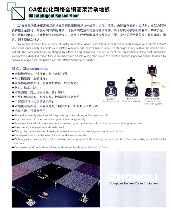 公司生產(chǎn)防靜電鋼質(zhì)、木質(zhì)機房地板和強化復(fù)合地板及各種電腦操作臺系列產(chǎn)品。該產(chǎn)品廣泛應(yīng)用于電子機房、通訊機房、各類實驗室和管線鋪設(shè)集中的防靜電場所以及家庭、大型商場的裝飾。公司技術(shù)力量雄厚、管理科學(xué),已具有設(shè)計、開發(fā)、市場營銷及售后服務(wù)的專業(yè)人才隊伍。
