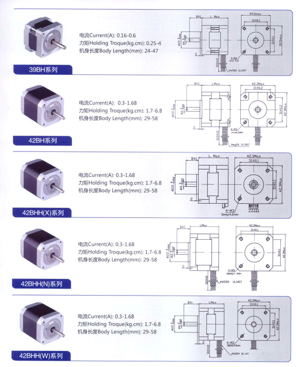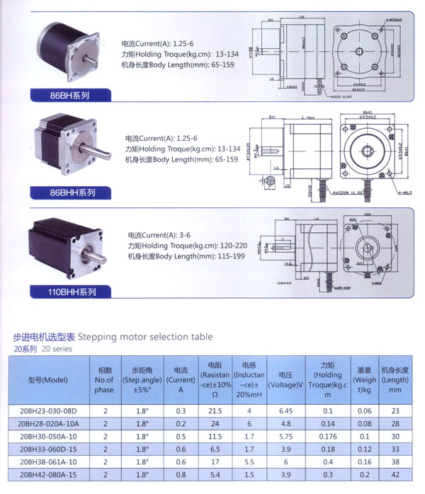 我公司的主要產(chǎn)品有20BH系列、28BH系列、35BH系列、39BH系列、42BH系列、42BHH系列、57BH圓形系列、57BHH方形系列、60BHH方形系列、86BH圓形系列、86BHH方形系列,以及110BHH系列的四相(二相)混合式步進(jìn)電。CW60BL、CW63BL、CW70BL、CW92BL系列無刷電機(jī)也相繼上市。另外步進(jìn)電機(jī)驅(qū)動器CW215、CW230、CW5045、CW8060、CW6060AC、CW1108以及全新數(shù)字式驅(qū)動器CWD230、CWD556、CWD860H、CW2M2208、CW3M2208和閉環(huán)電機(jī)驅(qū)動器CWDS556,CWDS660,CWDS860H,CWDS880L,CWDS1108,CWDS2206等系列也暢銷全球。另外本公司也可對外承接各種步進(jìn)電機(jī)及相關(guān)工控系統(tǒng)的應(yīng)用系統(tǒng)工程。