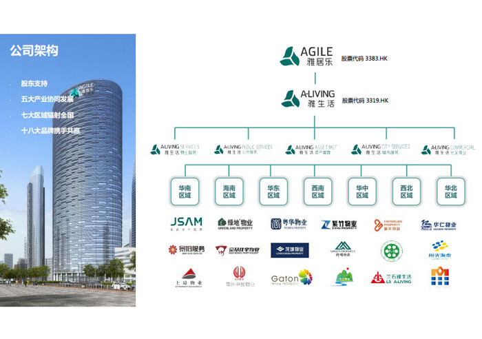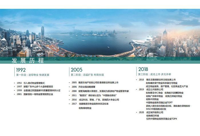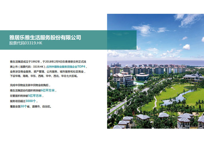 一、立足北上廣,面向全中國,走向全世界 1992年,雅居樂物業(yè)開篇中山,率先引入港式物業(yè)管理模式。1997年,依托雅居樂地產(chǎn)的崛起,連續(xù)接管中山多個(gè)項(xiàng)目,成為高端大盤物業(yè)管理的領(lǐng)跑者。1999年,雅居樂物業(yè)開啟專業(yè)化發(fā)展模式,全面通過英國皇家BSI的ISO9000質(zhì)量管理體系認(rèn)證,2001年成為國家首批一級(jí)物業(yè)管理資質(zhì)企業(yè)。 2002年,隨著廣州雅居樂花園的盛大啟幕,雅居樂物業(yè)邁開向廣州進(jìn)軍的步伐。為尋求更長遠(yuǎn)的發(fā)展,雅居樂積極構(gòu)思上市藍(lán)圖,2005年在香港成功上市。在深耕珠三角城市群的同時(shí),2006年雅居樂物業(yè)揮師北上,正式開啟全國部署戰(zhàn)略。2008年,接管海南清水灣項(xiàng)目,揭開旅游地產(chǎn)物業(yè)管理的新篇章。 接下來近十年里,雅居樂物業(yè)始終保持著最年輕的成長姿態(tài),依托“管理數(shù)字化、服務(wù)專業(yè)化、流程標(biāo)準(zhǔn)化和操作機(jī)械化”的發(fā)展戰(zhàn)略,雅居樂物業(yè)榮膺2018中國物業(yè)服務(wù)百強(qiáng)企業(yè)第11名,2018年中國物業(yè)服務(wù)百強(qiáng)企業(yè)成長性第二名、2018年中國物業(yè)服務(wù)百強(qiáng)服務(wù)質(zhì)量領(lǐng)先企業(yè)、2018年中國物業(yè)服務(wù)百強(qiáng)滿意度領(lǐng)先企業(yè)、2018中國物業(yè)服務(wù)百強(qiáng)經(jīng)營績效領(lǐng)先企業(yè)、旅游地產(chǎn)物業(yè)管理領(lǐng)先品牌、2018年中國辦公物業(yè)管理優(yōu)秀企業(yè)(綠地物業(yè))、2017中國物業(yè)管理企業(yè)品牌價(jià)值第12名、2017中國物業(yè)管理企業(yè)綜合實(shí)力第12名、中國藍(lán)籌物業(yè)企業(yè)、《旅游地產(chǎn)物業(yè)管理服務(wù)標(biāo)準(zhǔn)》(團(tuán)體標(biāo)準(zhǔn))起草工作等多項(xiàng)殊榮。 目前,雅生活集團(tuán)已形成廣州、中山、深圳、南京、上海、西安、成都、海南、云南、北京、鄭州、南寧、沈陽、武漢、馬來西亞十五大城市公司全面發(fā)展的蓬勃態(tài)勢。截止2017年12月31日,雅生活集團(tuán)管理范圍覆蓋全國逾69座城市與地區(qū),服務(wù)類型涵蓋主流住宅、高端豪宅、旅游地產(chǎn)、商業(yè)、寫字樓等多種業(yè)態(tài),合約總建筑面積為12610萬平方米,擁有200多個(gè)項(xiàng)目,服務(wù)業(yè)主逾100萬人。 2017年6月,雅生活集團(tuán)收購綠地物業(yè)100%股權(quán),并與綠地集團(tuán)簽署戰(zhàn)略合作協(xié)議,8月,綠地集團(tuán)投資10億元獲得雅生活集團(tuán)20%股權(quán)。未來,雅生活集團(tuán)將實(shí)施“雅居樂物業(yè)”與“綠地物業(yè)”雙品牌驅(qū)動(dòng)戰(zhàn)略,還將尋求在A股上市,力爭打造中國物業(yè)“A+H”第一股。