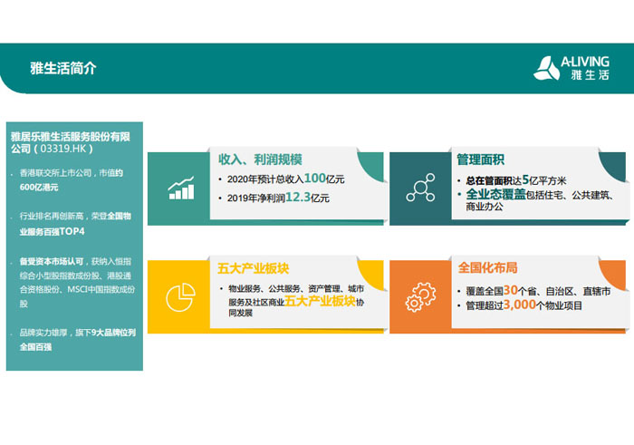 “人是雅居樂關(guān)注的核心,雅居樂不僅要蓋好房子,更希望全方位呵護(hù)業(yè)主的一生。” 2015年,雅居樂集團(tuán)重新定義社區(qū)服務(wù)理念,以聯(lián)動(dòng)發(fā)展模式,整合最優(yōu)質(zhì)的社區(qū)資源,為業(yè)主提供全面的居家生活解決方案。因此,雅居樂集團(tuán)“1+N”多元發(fā)展戰(zhàn)略規(guī)劃下的首個(gè)產(chǎn)業(yè)集團(tuán)——雅生活集團(tuán)應(yīng)運(yùn)而生。目前雅生活集團(tuán)已集結(jié)物業(yè)、科技、旅游、廣告、營銷、驗(yàn)房六大業(yè)務(wù)艦隊(duì)。2018年2月9日,雅生活集團(tuán)正式在香港聯(lián)合交易所主板掛牌上市(股票代碼03319.HK),成為中國首家紅籌分拆H股的物業(yè)服務(wù)企業(yè)。
