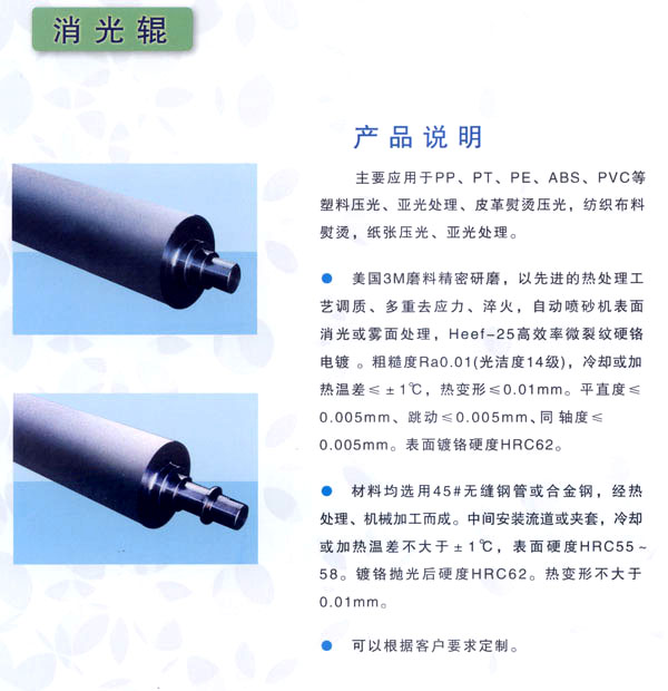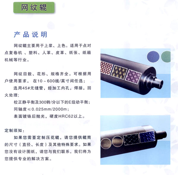常州市武進(jìn)區(qū)禮嘉鎮(zhèn)萬(wàn)超機(jī)械有限公司專(zhuān)業(yè)生產(chǎn)、加工花輥、鏡面輥、無(wú)紡布設(shè)備,及各類(lèi)機(jī)械配件。產(chǎn)品廣泛應(yīng)用于金屬、塑料、皮革、紙張、玻璃、木材、無(wú)紡布、衛(wèi)生材料、包裝裝潢等行業(yè)。 公司經(jīng)營(yíng)方針:服務(wù)鍥而不舍 品質(zhì)力臻卓越。得到國(guó)內(nèi)眾多客戶(hù)的厚愛(ài)與好評(píng)。 歡迎各界朋友蒞臨常州萬(wàn)超機(jī)械有限公司指導(dǎo)和業(yè)務(wù)洽談。 萬(wàn)超為顧客免費(fèi)打樣、并代客壓紋!