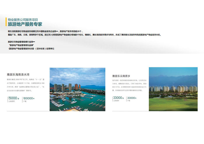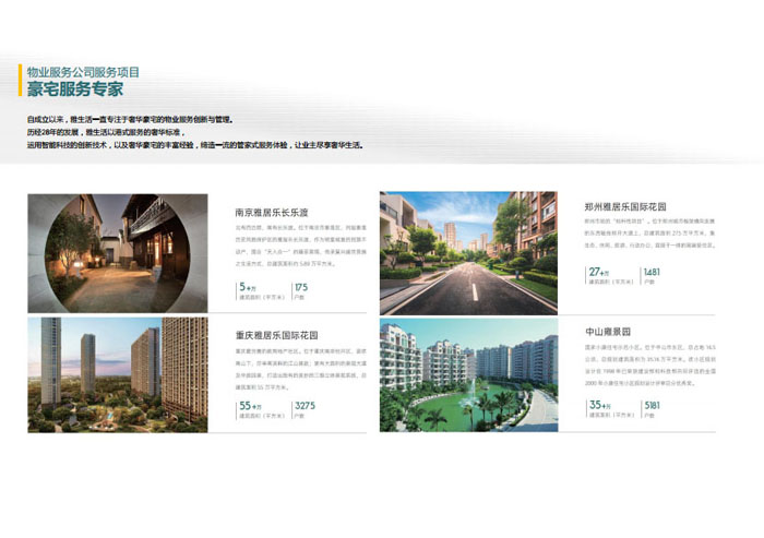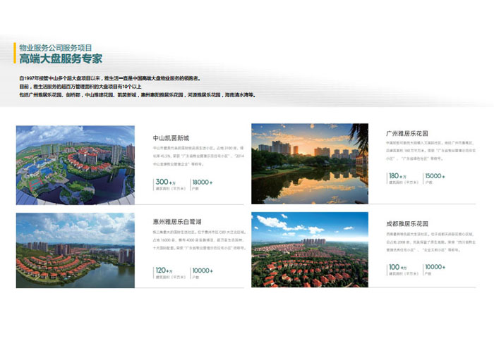 一、立足北上廣,面向全中國,走向全世界 1992年,雅居樂物業(yè)開篇中山,率先引入港式物業(yè)管理模式。1997年,依托雅居樂地產(chǎn)的崛起,連續(xù)接管中山多個(gè)項(xiàng)目,成為高端大盤物業(yè)管理的領(lǐng)跑者。1999年,雅居樂物業(yè)開啟專業(yè)化發(fā)展模式,全面通過英國皇家BSI的ISO9000質(zhì)量管理體系認(rèn)證,2001年成為國家首批一級物業(yè)管理資質(zhì)企業(yè)。 2002年,隨著廣州雅居樂花園的盛大啟幕,雅居樂物業(yè)邁開向廣州進(jìn)軍的步伐。為尋求更長遠(yuǎn)的發(fā)展,雅居樂積極構(gòu)思上市藍(lán)圖,2005年在香港成功上市。在深耕珠三角城市群的同時(shí),2006年雅居樂物業(yè)揮師北上,正式開啟全國部署戰(zhàn)略。2008年,接管海南清水灣項(xiàng)目,揭開旅游地產(chǎn)物業(yè)管理的新篇章。 接下來近十年里,雅居樂物業(yè)始終保持著最年輕的成長姿態(tài),依托“管理數(shù)字化、服務(wù)專業(yè)化、流程標(biāo)準(zhǔn)化和操作機(jī)械化”的發(fā)展戰(zhàn)略,雅居樂物業(yè)榮膺2018中國物業(yè)服務(wù)百強(qiáng)企業(yè)第11名,2018年中國物業(yè)服務(wù)百強(qiáng)企業(yè)成長性第二名、2018年中國物業(yè)服務(wù)百強(qiáng)服務(wù)質(zhì)量領(lǐng)先企業(yè)、2018年中國物業(yè)服務(wù)百強(qiáng)滿意度領(lǐng)先企業(yè)、2018中國物業(yè)服務(wù)百強(qiáng)經(jīng)營績效領(lǐng)先企業(yè)、旅游地產(chǎn)物業(yè)管理領(lǐng)先品牌、2018年中國辦公物業(yè)管理優(yōu)秀企業(yè)(綠地物業(yè))、2017中國物業(yè)管理企業(yè)品牌價(jià)值第12名、2017中國物業(yè)管理企業(yè)綜合實(shí)力第12名、中國藍(lán)籌物業(yè)企業(yè)、《旅游地產(chǎn)物業(yè)管理服務(wù)標(biāo)準(zhǔn)》(團(tuán)體標(biāo)準(zhǔn))起草工作等多項(xiàng)殊榮。 目前,雅生活集團(tuán)已形成廣州、中山、深圳、南京、上海、西安、成都、海南、云南、北京、鄭州、南寧、沈陽、武漢、馬來西亞十五大城市公司全面發(fā)展的蓬勃態(tài)勢。截止2017年12月31日,雅生活集團(tuán)管理范圍覆蓋全國逾69座城市與地區(qū),服務(wù)類型涵蓋主流住宅、高端豪宅、旅游地產(chǎn)、商業(yè)、寫字樓等多種業(yè)態(tài),合約總建筑面積為12610萬平方米,擁有200多個(gè)項(xiàng)目,服務(wù)業(yè)主逾100萬人。 2017年6月,雅生活集團(tuán)收購綠地物業(yè)100%股權(quán),并與綠地集團(tuán)簽署戰(zhàn)略合作協(xié)議,8月,綠地集團(tuán)投資10億元獲得雅生活集團(tuán)20%股權(quán)。未來,雅生活集團(tuán)將實(shí)施“雅居樂物業(yè)”與“綠地物業(yè)”雙品牌驅(qū)動戰(zhàn)略,還將尋求在A股上市,力爭打造中國物業(yè)“A+H”第一股。
