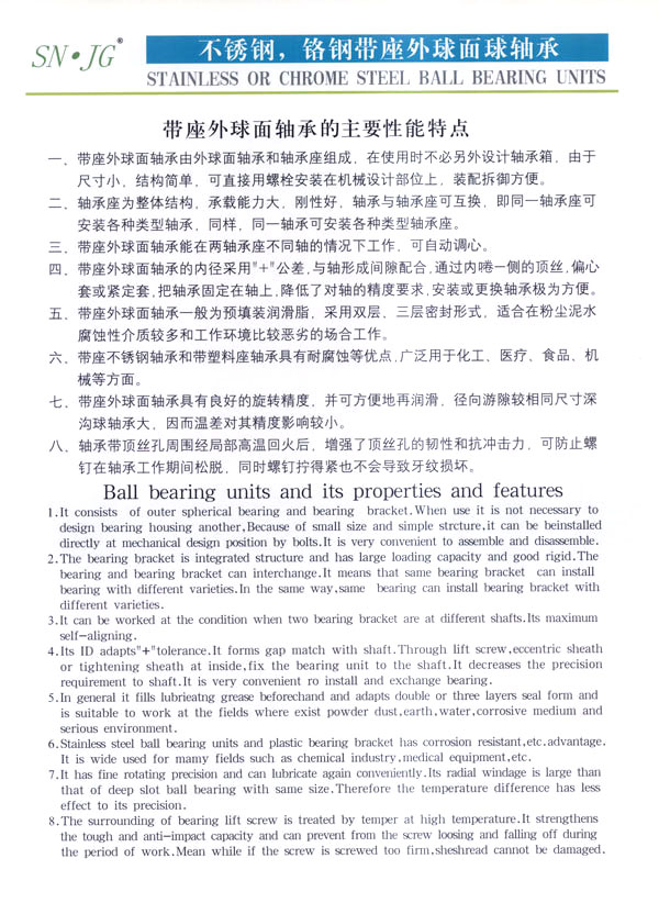 常州市武進(jìn)蘇南軸承有限公司是生產(chǎn)鋼球及帶座外球面軸承的專業(yè)工廠,主要生產(chǎn)蘇南牌“SN”不銹鋼球、鉻鋼鋼球,以及不銹鋼、鉻鋼UC、UCX、UK、HC、SB、SA、SER、UOOO、KOOO及其它非標(biāo)系列各類帶座外球面軸承、偏心套、緊定套等產(chǎn)品。本廠生產(chǎn)規(guī)格有軸承鋼球0.5-150m/m,碳鋼球0.5-150m/m,不銹鋼球0.8-50m/m,同時定做各種特殊規(guī)格的不銹鋼球、銅球、陶瓷球等。為廣大用戶提供品質(zhì)優(yōu)良,規(guī)格齊全,價格合理的各種鋼球。 本公司位于常州南部,錫宜高速公路串境而過, 交通便利。南瀕風(fēng)景秀麗的太湖,沿湖丘陵地帶人文景觀豐富,為常州市武進(jìn)區(qū)太湖旅游度假區(qū) 。本廠環(huán)境優(yōu)美,具有良好的生產(chǎn)環(huán)境,我們竭誠歡迎國內(nèi)外的朋友進(jìn)行廣泛多樣的經(jīng)濟(jì)合作交往和貿(mào)易合作,并為你提供優(yōu)良的服務(wù)。 本公司技術(shù)力量雄厚,工藝裝備先進(jìn),檢測手段完備,產(chǎn)品質(zhì)量穩(wěn)定,使用性能各項指標(biāo)都達(dá)到國際先進(jìn)水平,產(chǎn)品主要銷往美國、法國、德國、日本、意大利、澳大利亞、韓國、加拿大、及東南亞等國家和地區(qū)。本公司的“SN”商標(biāo)鋼球及帶座外球面軸承已贏得國內(nèi)外廣大用戶的信賴。 本公司具有外貿(mào)自營出口權(quán),并于2002年9月通過ISO9001-2000版質(zhì)量體系認(rèn)證,于2004年8月通過“CQC”產(chǎn)品質(zhì)量認(rèn)證。