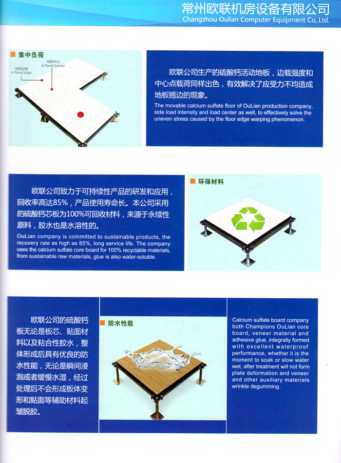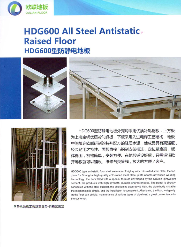 防靜電高架活動(dòng)地板、全鋼地板、陶瓷地板是計(jì)算機(jī)行業(yè)發(fā)展起來的新型鋪地材料,隔離了潮氣、靜電灰塵,最重要的是解決了綜合布線問題,無需預(yù)埋管線,可隨時(shí)拆卸、搬移,保證了資訊設(shè)備完整的優(yōu)點(diǎn),適應(yīng)了智能化樓宇中信息自動(dòng)化技術(shù)對所處環(huán)境的特定要求,避免了廣大客戶的雙重投資,使現(xiàn)代化辦公程度更加高效,辦公場所更加舒適。 “歐聯(lián)”系列全鋼地板,符合國家安全要求,種類完備多樣,其中防靜電陶瓷地板、硫酸鈣地板等除具有普通瓷質(zhì)的裝飾和實(shí)用性外,其耐磨、防水、防火功能優(yōu)于其它同類產(chǎn)品,防靜電系列地板,能切合不同客戶的要求,其靈活的配置,深受客戶歡迎,不同材質(zhì)的地板結(jié)構(gòu)使設(shè)計(jì)師的設(shè)計(jì)空間比傳統(tǒng)的更加廣闊自由和善變。 公司大力發(fā)展國內(nèi)外銷售業(yè)務(wù),多次中標(biāo)國內(nèi)重點(diǎn)工程 ,例:哈爾濱醫(yī)科大學(xué)、山東大學(xué)、上海普通機(jī)場等。 公司將一如既往開發(fā)和制造一流的產(chǎn)品,愿與廣大有識之士合作發(fā)展,共創(chuàng)美好未來。