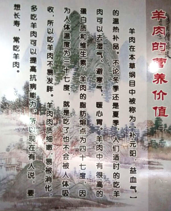 鄭陸橋頭羊肉館主要從事羊肉、羊肉制品的加工。羊肉性溫?zé)帷⒀a(bǔ)氣滋陽、暖中補(bǔ)氣、開胃健脾、還可以去濕氣避寒冷,暖胃寒、養(yǎng)吃百草、養(yǎng)根據(jù)自身生理需要選擇草木、固羊有“百藥之庫”之稱。古人云:多吃羊肉、健康長壽。
