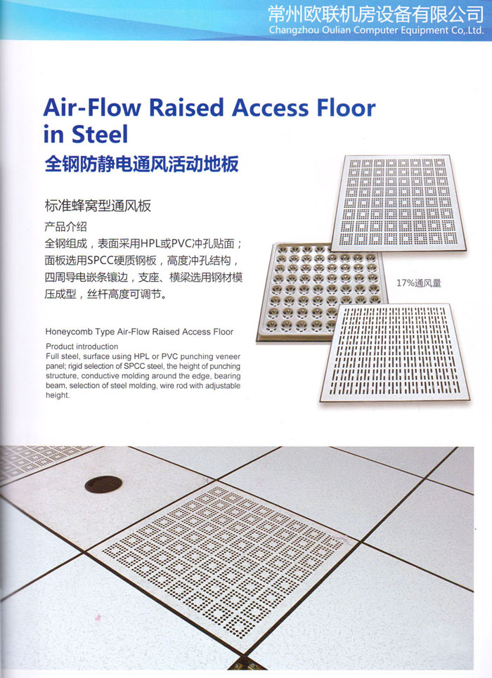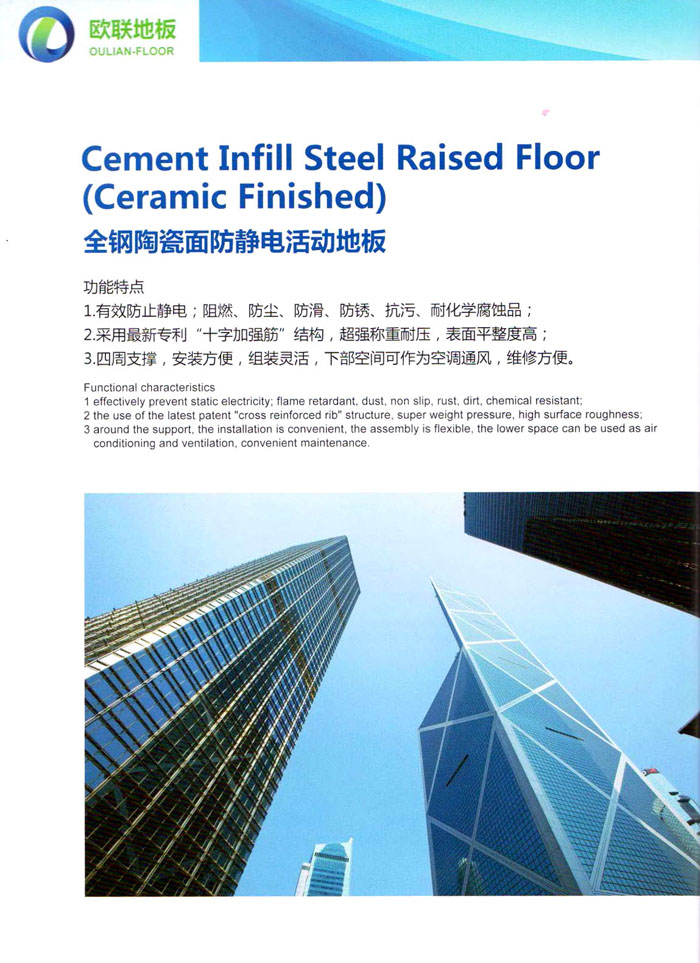 “歐聯(lián)”系列全鋼地板,符合國家安全要求,種類完備多樣,其中防靜電陶瓷地板、硫酸鈣地板等除具有普通瓷質(zhì)的裝飾和實用性外,其耐磨、防水、防火功能優(yōu)于其它同類產(chǎn)品,防靜電系列地板,能切合不同客戶的要求,其靈活的配置,深受客戶歡迎,不同材質(zhì)的地板結(jié)構(gòu)使設(shè)計師的設(shè)計空間比傳統(tǒng)的更加廣闊自由和善變。