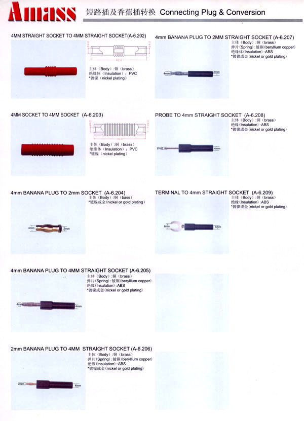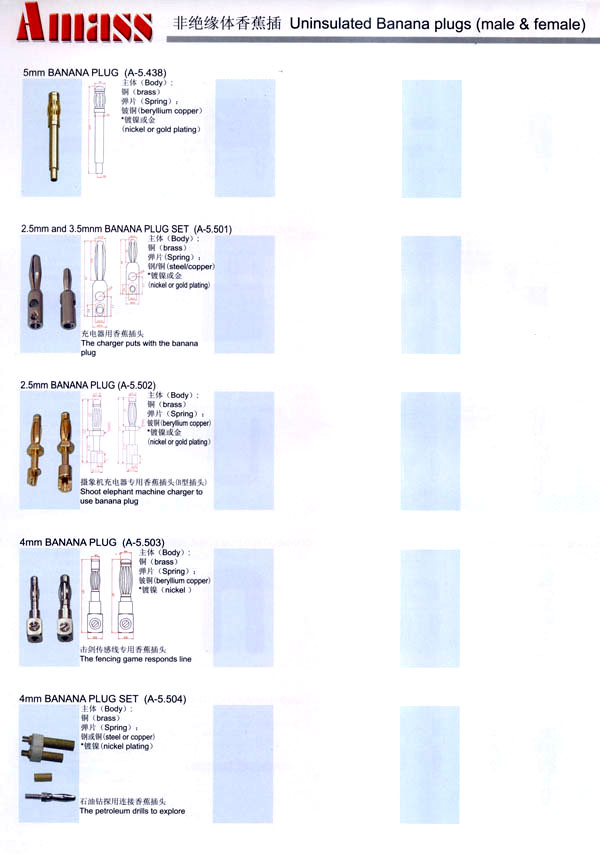 本公司專業(yè)生產(chǎn)各類香蕉插頭,香蕉插座,接線柱,電瓶夾,鱷魚夾,測試導(dǎo)線,測試筆等。產(chǎn)品分2mm/2.5mm/3mm/3.5mm/4mm五大系列,百余種款式, 各種香蕉插廣泛用于儀器、儀表、電力測試、教學(xué)、玩具,視聽設(shè)備、醫(yī)療儀器,保健產(chǎn)品等領(lǐng)域。公司技術(shù)力量雄厚,生產(chǎn)工藝先進(jìn),產(chǎn)品遠(yuǎn)銷港、臺、歐美,并與飛利浦等國際品牌配套。公司本著精益求精的理念,歡迎新老客戶光臨。 我們擁有資深的工程師和豐富的電子產(chǎn)品銷售經(jīng)驗,專業(yè)生產(chǎn)各類電子接插件產(chǎn)品。 香蕉插頭,香蕉插座,電瓶夾,鱷魚夾等品種齊全、 質(zhì)量可靠,致力服務(wù)于通訊、數(shù)據(jù)通信、消費(fèi)類電子產(chǎn)品、計算機(jī)和計算機(jī)外圍設(shè)備以及工業(yè)應(yīng)用等領(lǐng)域,能給客戶提供全面采購解決方案。 我們秉承穩(wěn)健作風(fēng)、誠實經(jīng)營、合理價格、完善服務(wù)的宗旨,在全體客戶的支持下,公司不斷創(chuàng)新進(jìn)取,業(yè)績蒸蒸日上,已與數(shù)十家電子零件制造商及其分支機(jī)構(gòu)建立密切合作關(guān)系,在國內(nèi)擁有數(shù)百家固定客戶。